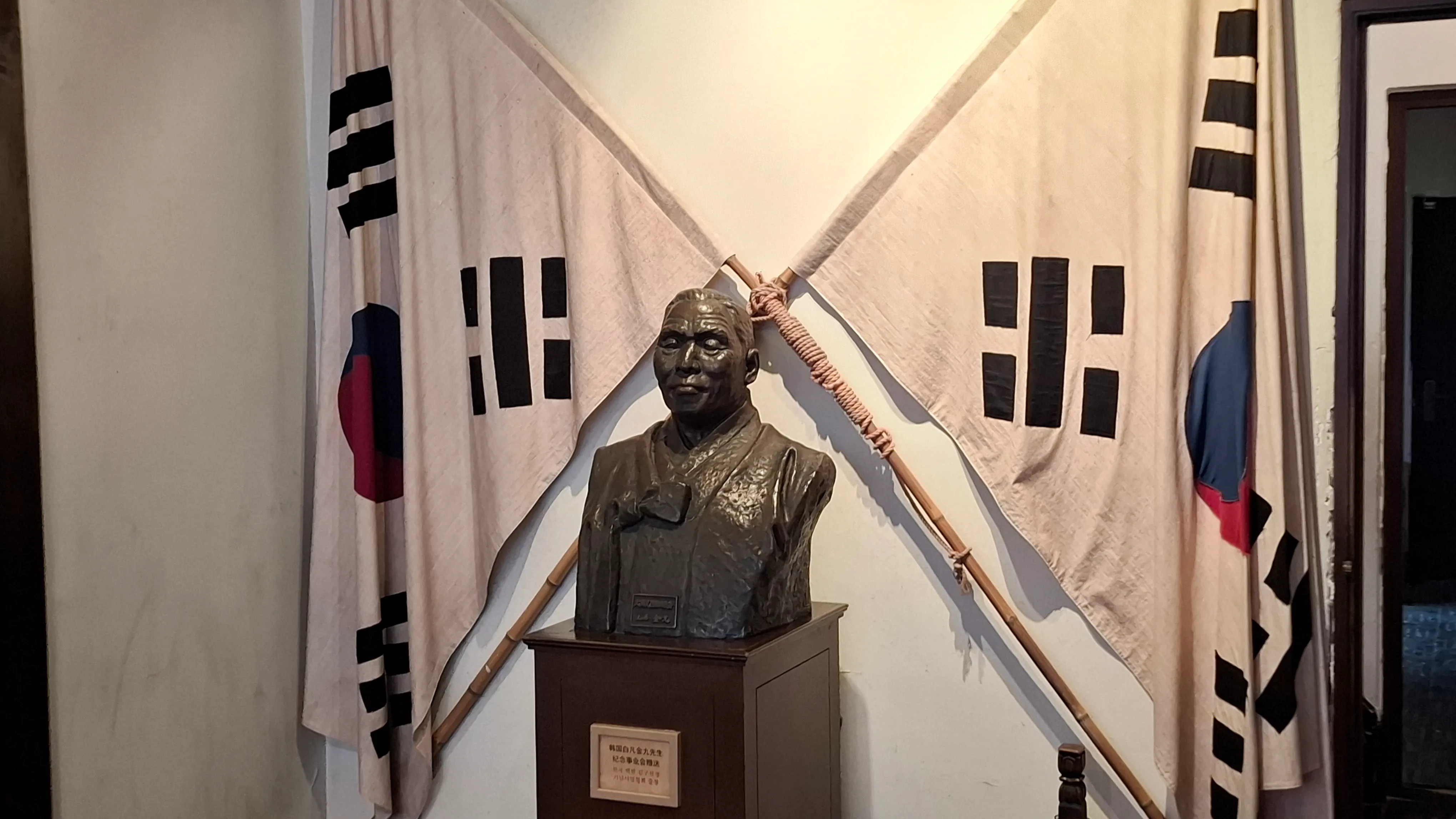 我今天去的临时政府旧址,是1926年金九当选临时政府国务领班后的住所(重庆也有一处临时政府旧址,只有文在寅去过那里)。整体是一栋窄小隐蔽的三层小楼,藏在新天地对面路边的巷子里,有种“大隐隐于市”的即视感。进门后是一间狭长的会客厅,正门对墙放着金九塑像和临时政府的旗帜,左侧墙上挂着临时政府的历任领导人照片,最左边是李承晚(带数学家),右面有李相龙和金九等(顺序记不得了,应该是临时政府首班的届次顺序)。继续往里面走就是厨房,客厅和厨房中间便是窄而陡峭的木头楼梯。台阶还很短,只能小心翼翼地走上去。台阶上承载了厚重的岁月,莫名有种穿越时空之感。