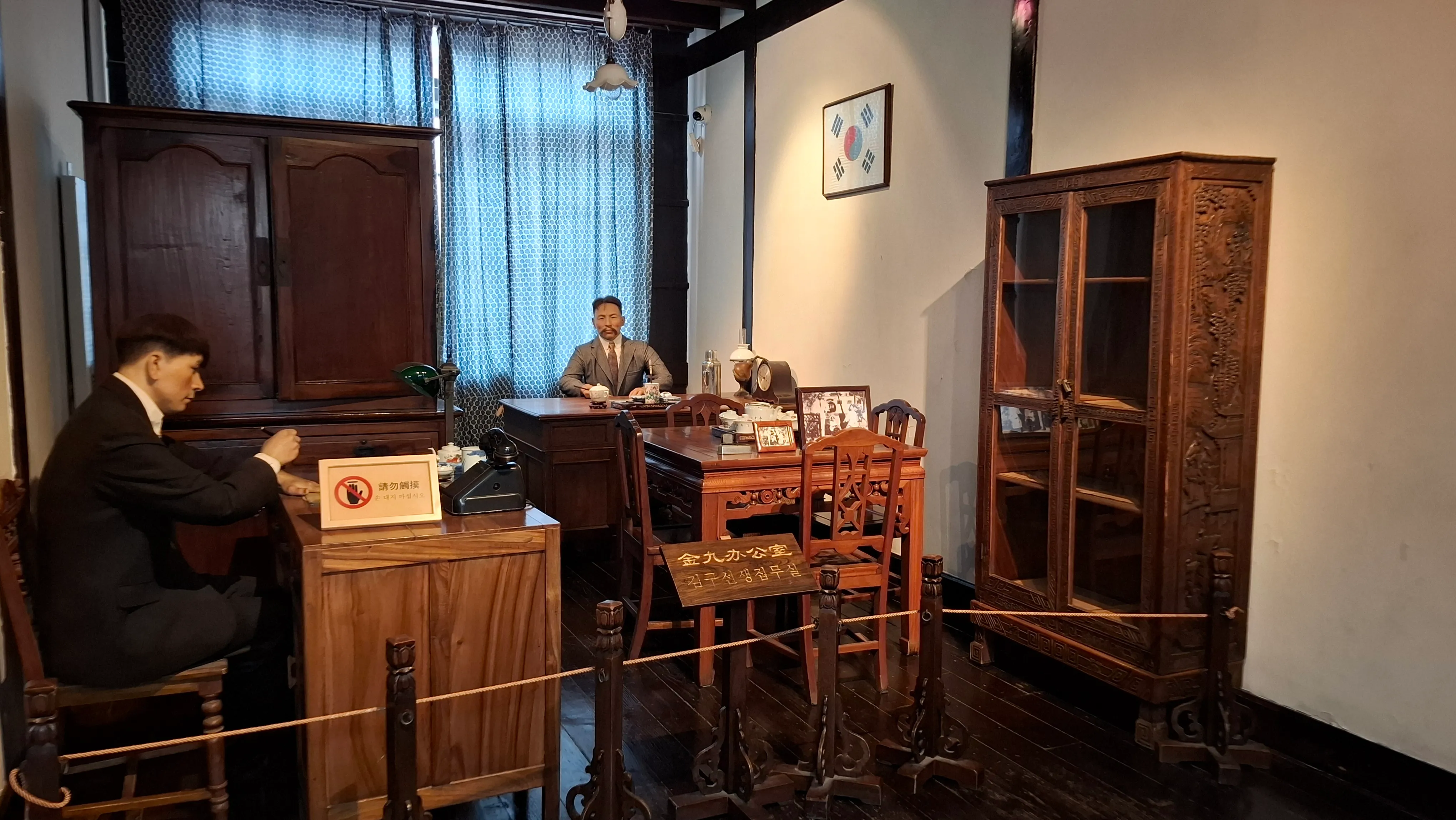 上到二楼。左手边办公室里,金九和他的秘书这两个假人在场景的打光下有些以假乱真,我一眼看去差点被吓到。虽然是后来添置的家具,但是氛围做的还是不错的。再往前走便是金九的卧室,内有三张木床,没什么特别的装饰。从卧室出来转过去便是展览厅了,一路介绍了临时政府自19年成立到45年抗战胜利后返回祖国的颠沛流离的历史。